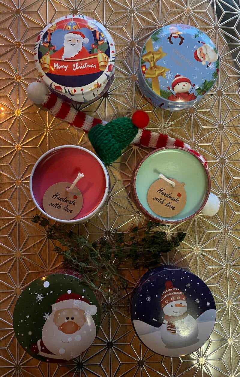 Kerstkaarsjes, leuk als cadeau, 5 euro per stuk. zonder geur, kleuren rood en groen met leuke print.